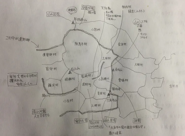 遠野郷出身の佐々木さんが話す、故郷のお話。それがなんとも面白かったんで、柳田さんがそれを書き留めたのが『遠野物語』だ。遠野郷ってのは、附馬牛、土淵、松崎、青崎、上郷、小友、綾織、鱒沢、宮森、達曽部の10村からなる風光明媚なところではあるんだけど、聞くだになんともヤッバイところみたいだ。たとえば……
