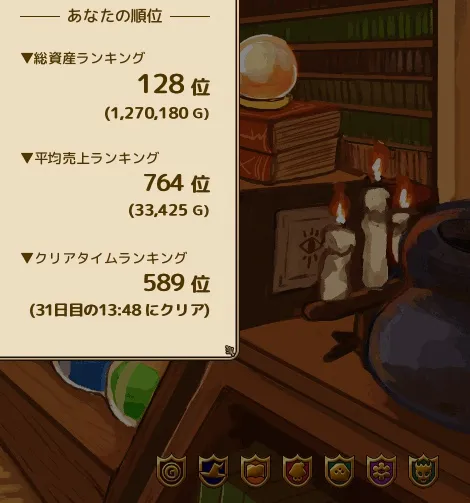 - 難易度はすごくイージー。システムはシンプル。キャラは竹を割ったようなわかりやすい性格。小さなマップ。という非常にコンパクトなゲーム。素材集めも簡単で、敵を集めてからの殲滅とか爽快感あってストレスフリー。オートセーブも実装されててプレイしやすさ半端ない。アイテムレシピのドロップ率が低いが、レシピ屋さんが用意されており手抜かりない。プレイがノッてる勢いで称号がコンプできて、気分が良いまま終われた。いやあ、自作ゲームの難易度を高くしすぎるゲーム制作初心者が見習うべきユーザビリティだったな!(自戒)