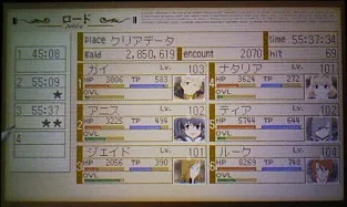 データ1が一周目のラスボス前、データ2が二周目のラスボス前なわけだが、ある意味強くてニューゲームにも関わらず二周目のがタイムが長いというのがね。どんだけサブイベントが膨大かってのと一周目ではどんだけサブイベントを見逃してんのかってのが表れている。