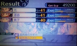 ![]() | 「レベル30であれだけ苦労した雑魚敵が、光くんのアナコンダ一撃で 消し飛ぶようになっちゃったわね。 いやー充実したレベリングだったわ。」 |