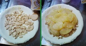 パイ生地を皿に敷く。砕いたビスケット+煮リンゴを交互に載せる。