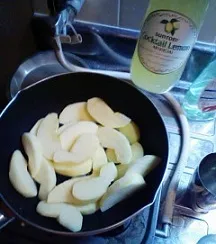 薄めに切ったリンゴ+砂糖スプーン1.5杯位+レモン汁を少し。蓋して弱火で煮る。