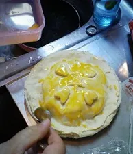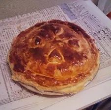 パイ生地でフタ。底とフタの接着面には卵黄を塗る。表面にも塗る。