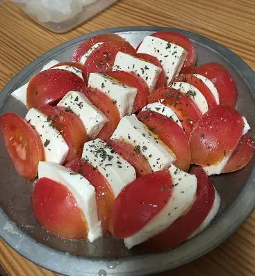 塩豆腐でつくったカプレーゼ。塩豆腐は水切りした絹ごし豆腐の全面に塩をまぶしてキッチンペーパーでくるみ、冷蔵庫に放置しさらなる水切りを行えば完成する。俺はだいたい丸一日放置したかな。こういった面倒なものは一人暮らしではやらないが、披露する相手がいるなら別だ。楽しくやれる。