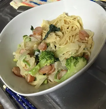 - 1. ウィンナかベーコンの薄切り・玉ねぎ・ほうれん草・ブロッコリーを炒める