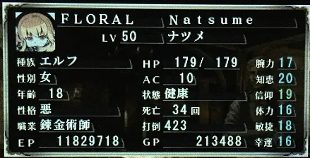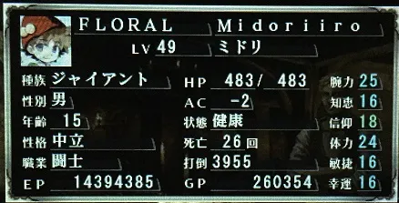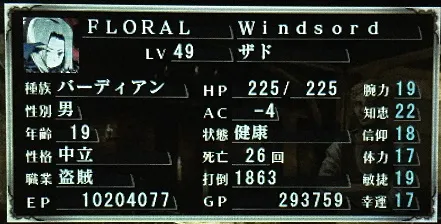 前衛ナンバー2のザドさん。盗賊だけあってレベルの上がりが速い。上述の通り、装備解除でボス戦の戦況を一気にひっくり返すワイルドカード。さらにこのレベルになると宝箱のトラップ感知をほぼミスらないので、女神の口づけを逃さず利用することができる。通常攻撃の火力が他の前衛に一歩劣るので、そのへん改良の余地あり。