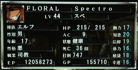 サブマスター、スペさん。メイン魔法使いだが、ちと魔法の火力に不満がある。どちらかといえば僧侶呪文で回復を担当することのほうが多いようだ。さすがに敵後衛を一掃できないのはマズいので、装備をもっと大艦巨砲主義にソフィスティケートすべきか。