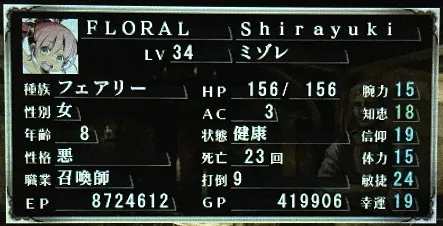 レベルの伸びがビックリするほどすっとろい霙ちゃん。前情報のとおり、マジで召喚契約が成功しない。けれどまあこれは、召喚師側の問題点というより闘士のオーラパンチ取得待ちだろう。今のところはカゲロウとかゴーストサマーといった首切り持ち・奇襲防止のモンスターを使役しているけども、けっこう便利に使えてる。普段はやることがないので癒やしの歌をひたすらかき鳴らしてる。