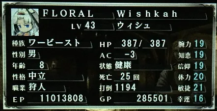 ギルドマスター、ウィシュさん。追撃目当てで狩人になっていただいたのだが、思いの外つかう場面が少ない。バステの入る確率が低いので、バステを飛ばすよりもダメージ系の魔法を使うことが多いからだ。ただし足が速く攻撃力があるので頼りにはなる。とくに改善の余地はなし。