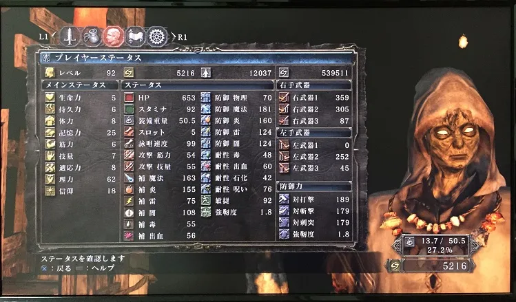 - 記憶力と理力はいいとして信仰は『帰路』の奇跡のため上げた。プレイが相当気楽になったぜ。ボス戦からも離脱できるってのが大発見だった。