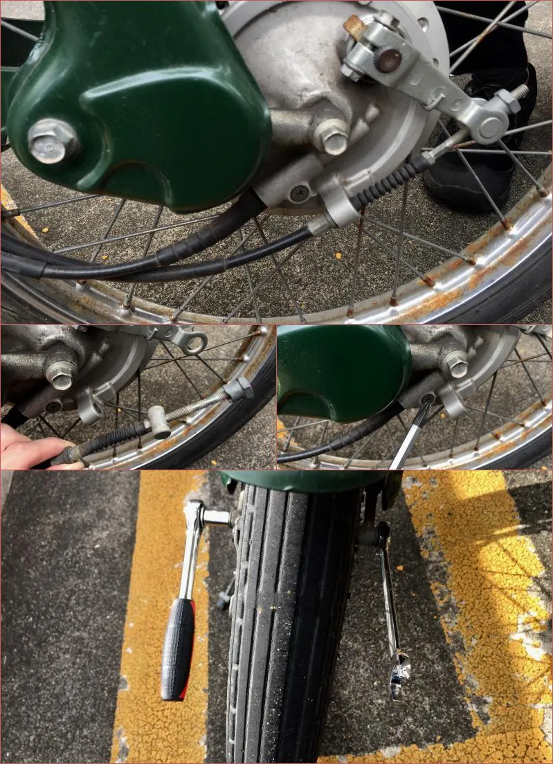 - ブレーキワイヤーのネジ位置にしるしをつけておく。(もとの位置に戻すため。)