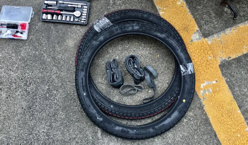新品のタイヤ、チューブ、バンドをセット
