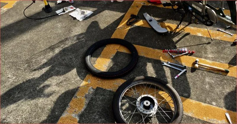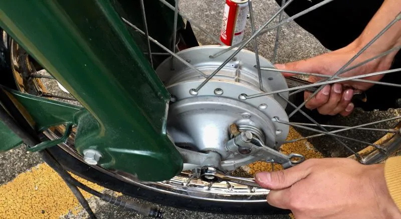 - 前輪を外す。必要なのは 17mm 12mm のレンチだった。両側に差し込んで両側から一気に回して外す。