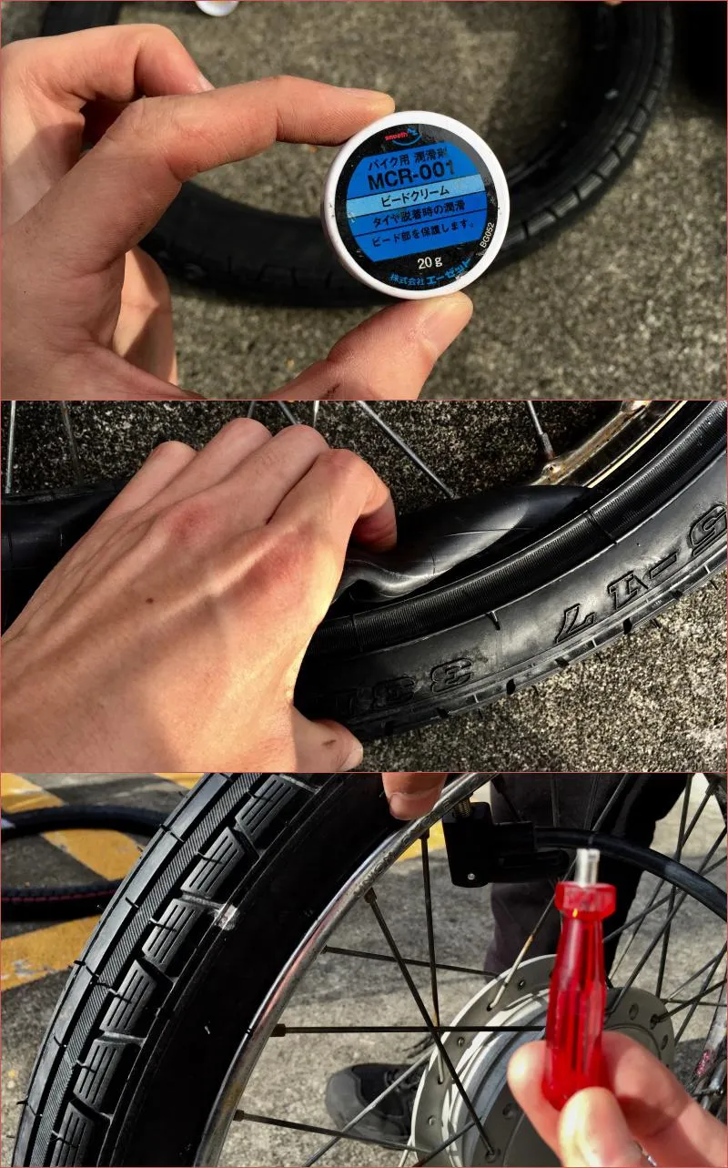 - ビードクリームとやらをタイヤのフチに塗る。チューブが入りやすくなるようにしているらしい。
