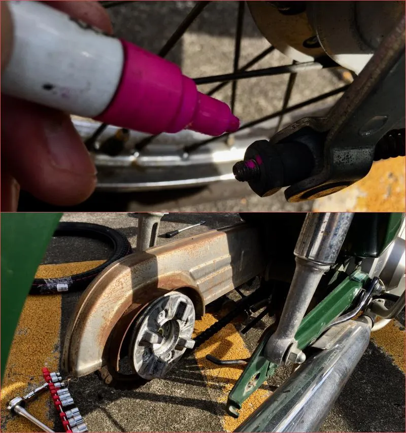 - 前輪と同じように、ブレーキワイヤーのネジ位置にしるしをつけておく。