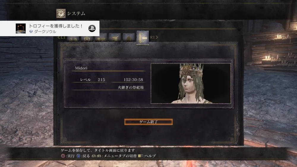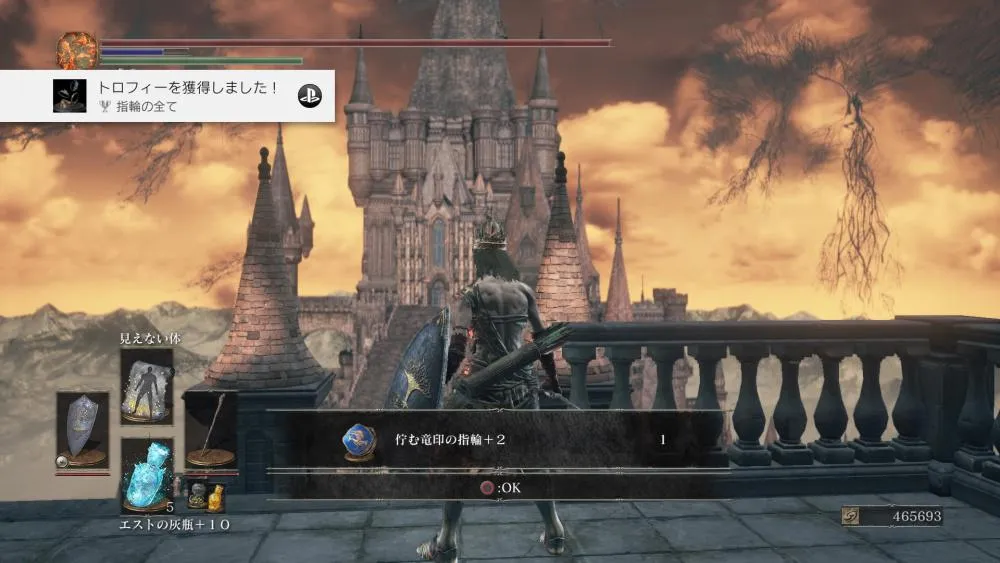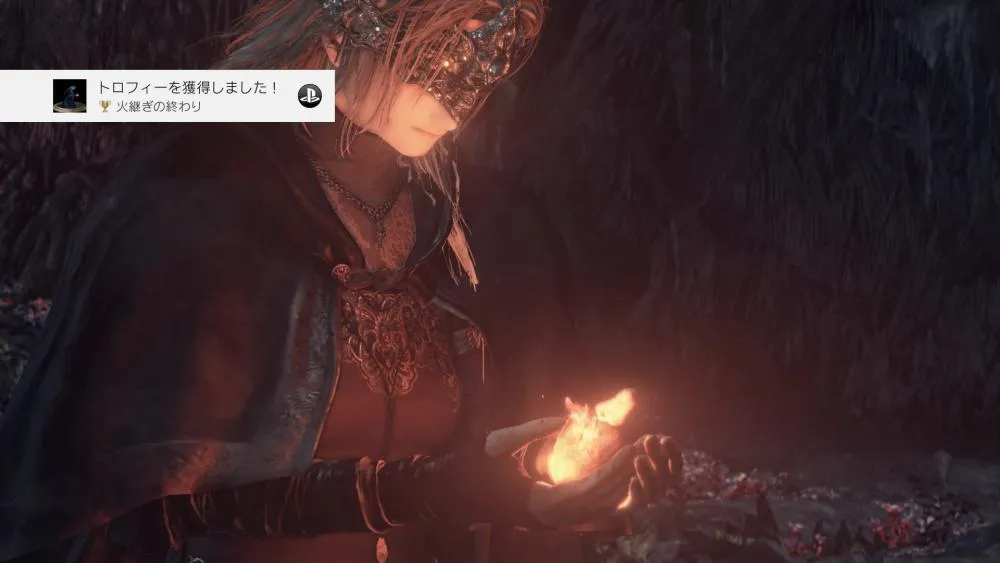 - 火継ぎの終わりエンドでクリア -> トロフィー