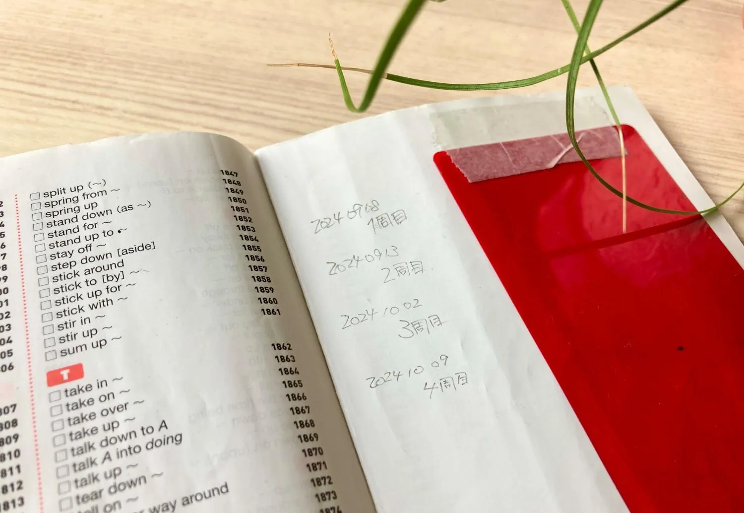 - 単語編については、1. まず単語だけ見て → 2. わかんなかったら例文を見て → 3. それでもわかんなかったら日本語を見る、という順序でずーっと進めた。1でクリア出来たものだけ “次回から見なくていい” ことにして、周回効率を上げた。