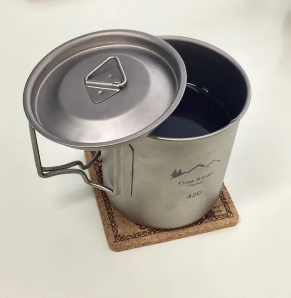 今回選んだのはゴートレンジの420mlマグ。上述の条件を満たすマグのなかで、お安めのものを選択した。チタンマグというジャンルではスノーピークのものが有名らしいのだけど、スノーピークで蓋のあるものはなかったね。