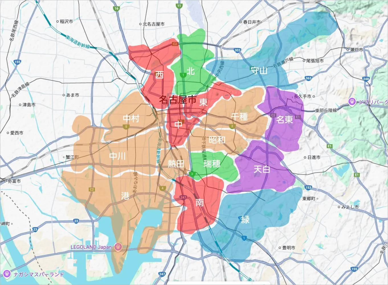 - 1975年に、名東区、天白区。千種区と昭和区が人増えすぎたので分かれた。