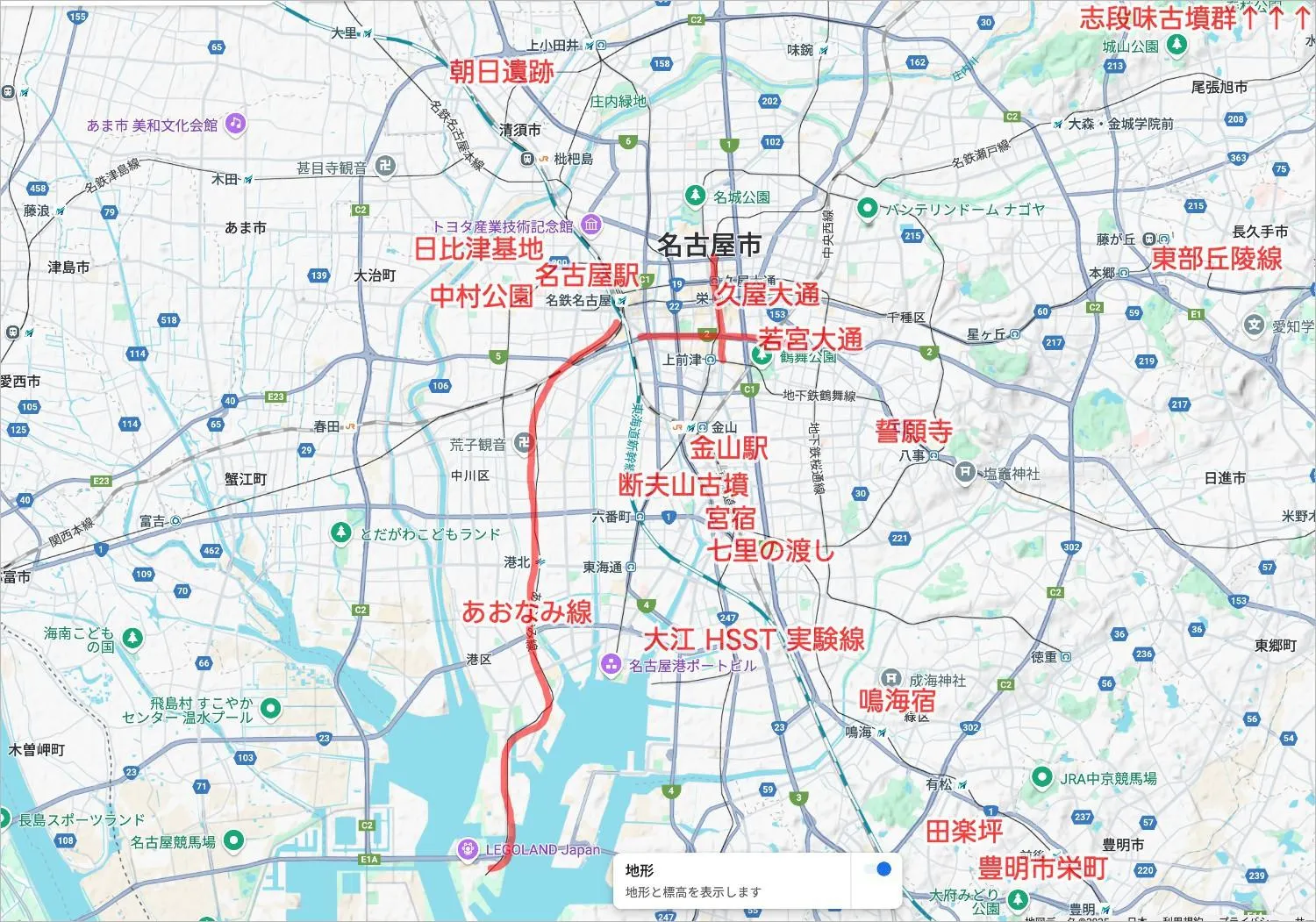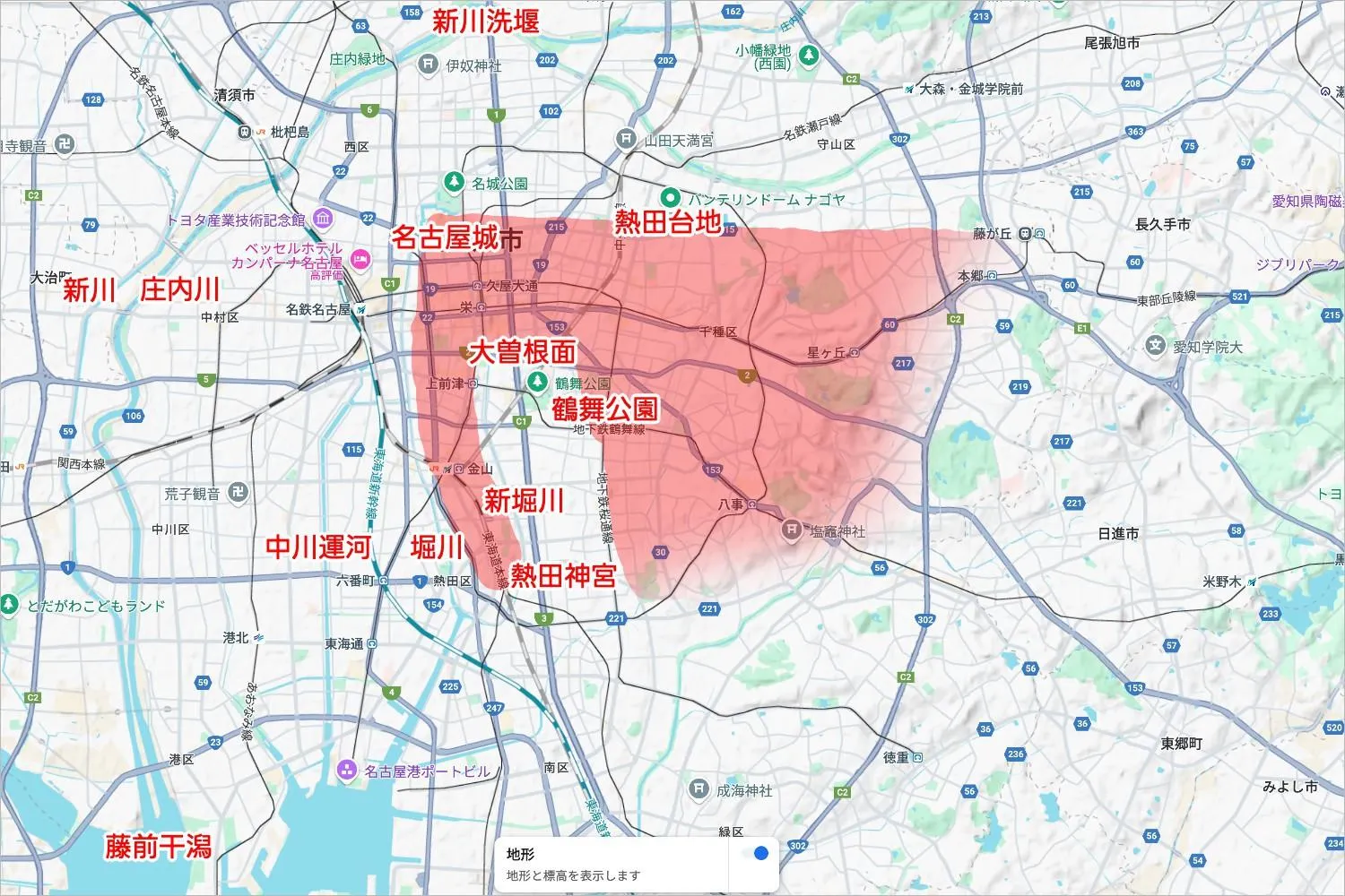 - 名古屋城が左上に来るような長方形で、熱田台地があるんだよねー。左を向いた象みたいなシルエットだ。