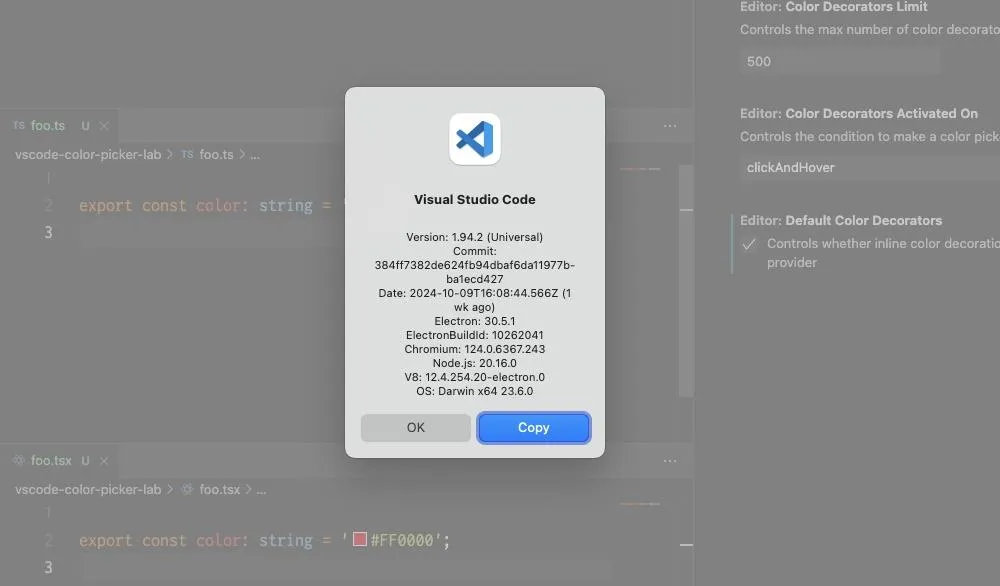 ああ、はいはい。 VScode で、16進数カラーのプレビューを見ることが出来る大変便利な機能、正式には inline color decoratorsのことを言ってやがるな? それが、 JavaScript ファイルや TypeScript では出てくるのだが、 React.js のファイル形式である TSX ファイルでは出てこないと。