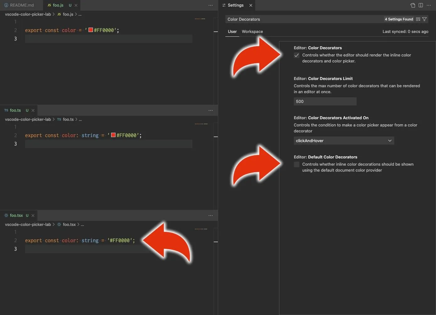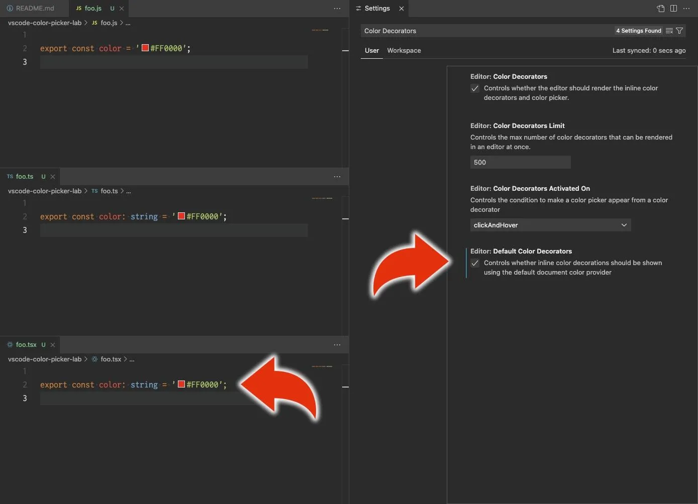 - 設定画面を出す > Color Decorators で検索 > Color Decorators を ON にする