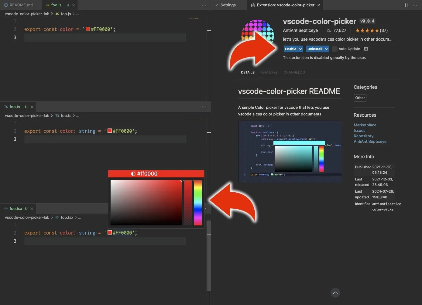 が、もう不要だ。 VScode は規定でその機能をサポートしている。以下のように、拡張機能がなくとも、色プレビューもカラーピッカーも動く。