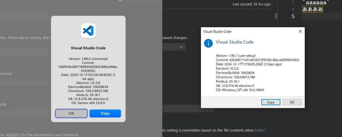Mac と Windows の VSCode バージョンは、以下の通り。